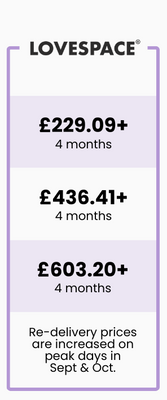 Lovespace | NO | YES £6.95 £9.95 for Saturday | NO | YES Additional £30 Only available in certain locations. | YES | NO | YES £7 per item per 25 miles |